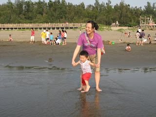 傅小弟第一次踩著沙,沙子還有溫燙的感覺,麻麻牽著他,隱約感覺到他有害怕的感覺(哀,我的兒子好膽小喔!難道是我忘了生膽子給他嗎?)鼓勵好久他才慢慢往海邊走去。