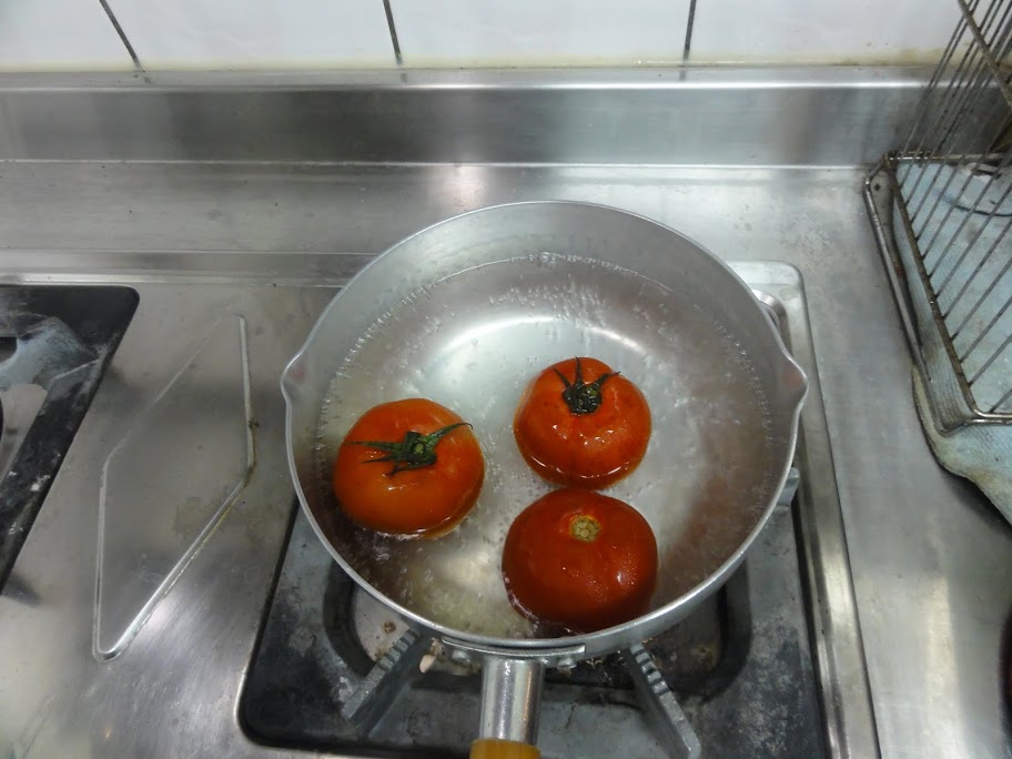先煮一鍋水燙蕃茄,放涼後去皮切塊,備用。
